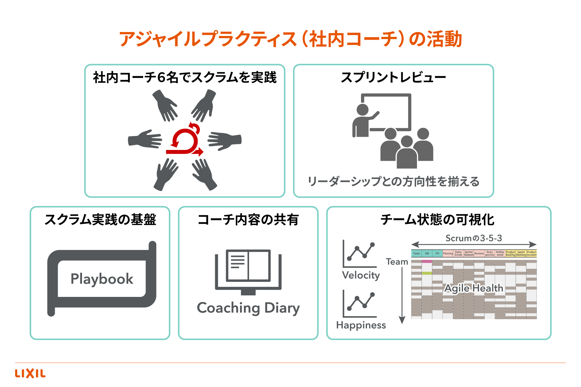 アジャイルプラクティスとは、社内のアジャイルコーチで構成されるチームを指し、LIXILのデジタル部門をアジャイルな組織に変えることをミッションとする。もちろんアジャイルプラクティスも、スクラムを取り入れて、スクラムチームとして働く。