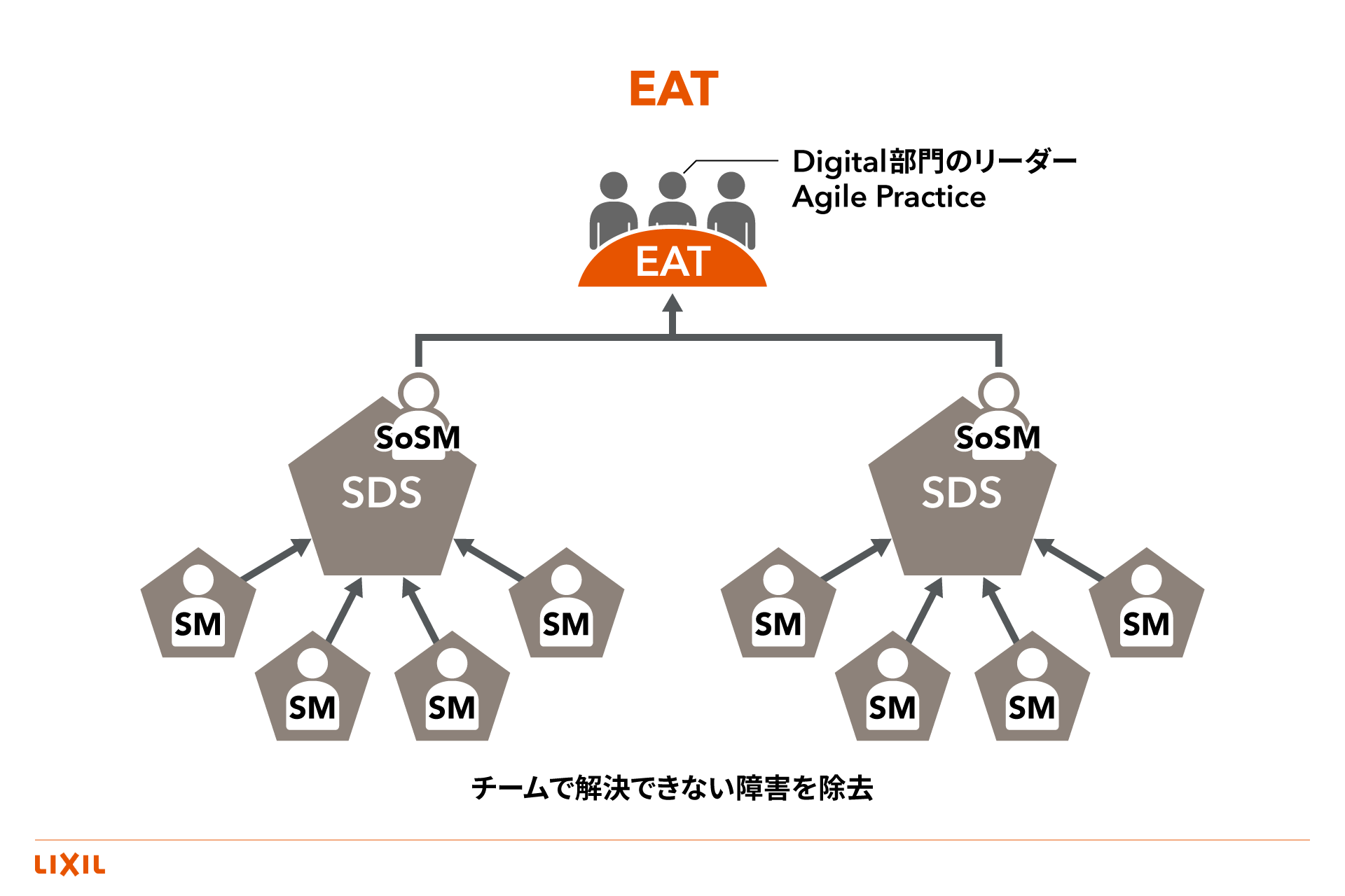 EATとEMSは、スクラム組織のリーダー的な存在だ。EATは、チームでは解決できない、組織レベルで協力しなければならない課題や障害を解決する。LIXILの場合、アジャイル組織出身のデジタル部門のリーダーがEATを結成し、各チームのスクラムマスターと連携して、様々な障害を迅速に解決している。