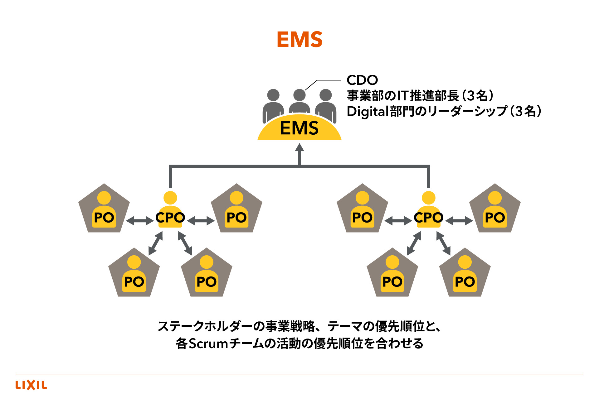 リーダーシップとチーフプロダクトオーナーの定期的なフォーラムであるEMSは、組織全体の意思決定とバックログの優先順位を決め、各スクラムチームのバックログとの整合性をとる役割を担う。