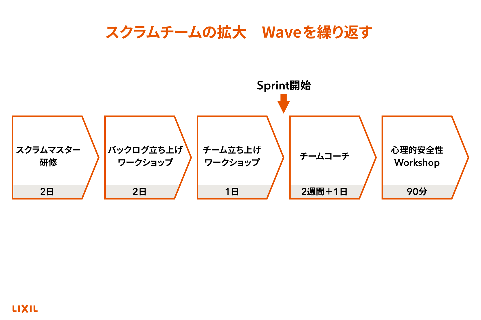 Scrum Inc.は、応募したチームに対し、2日間のスクラムマスター養成研修と、3日間のチーム立ち上げワークショップ、2週間のコーチングを実施。LIXILデジタル部門では、このスクラムチームの立ち上げの一連の過程をWaveと名付ける。2ヶ月毎にこのWaveを繰り返し、Scrum@Scale組織を徐々に拡大していった。