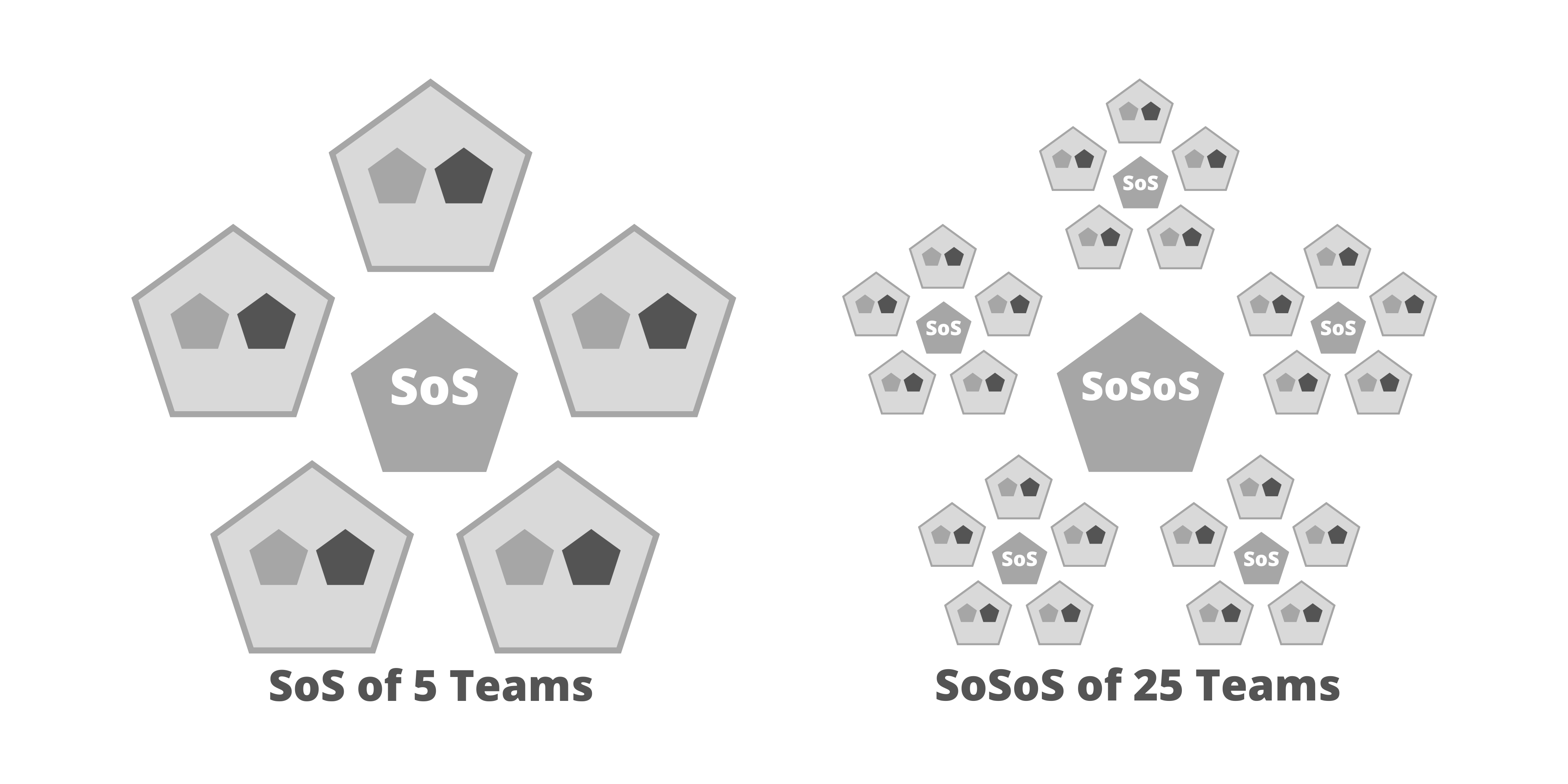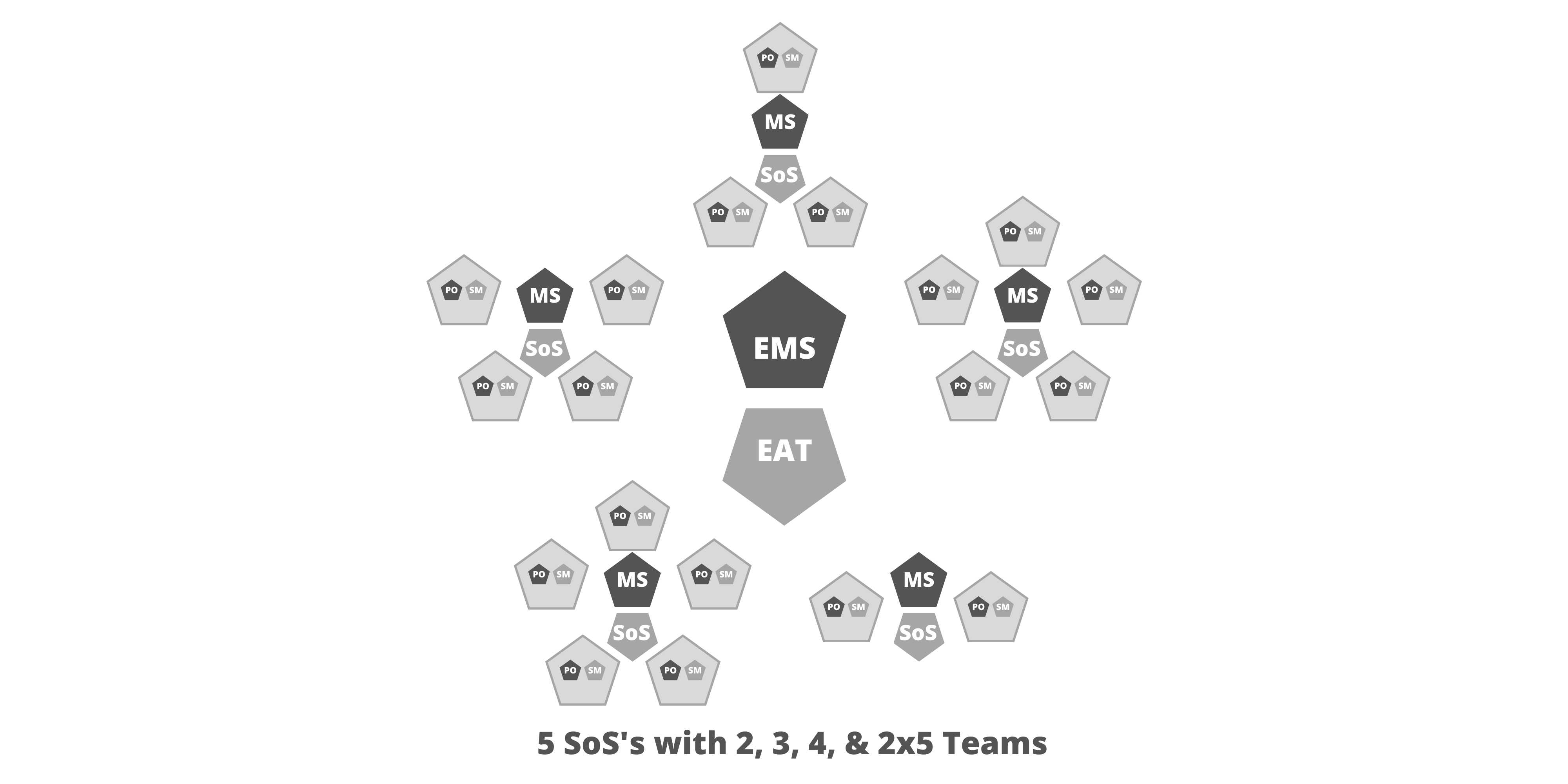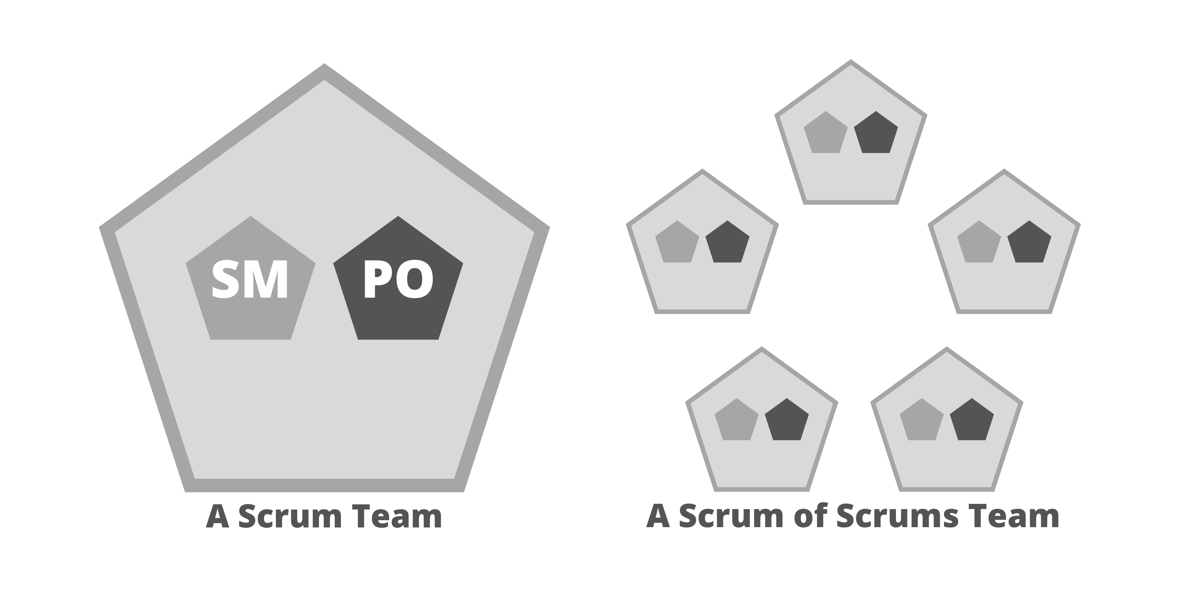 注意: 上図およびこの後の図では、薄い灰色で囲まれた五角形がチームを表す。状況に応じて、SMとPOをこれより小さい五角形で表すことにした。組織図は組織によって大きく異なる可能性があるため、これらの図は例示のみを目的としている。実装の規模に応じて、複雑なプロダクトの提供には複数のスクラムオブスクラムが必要な場合がある。そのような場合には、複数のスクラムオブスクラムからスクラムオブスクラムオブスクラム(SoSoS)を編成できる。それぞれが、各スクラムオブスクラムからスケールされたそれ自身の役割、作成物、イベントを持つことになる。