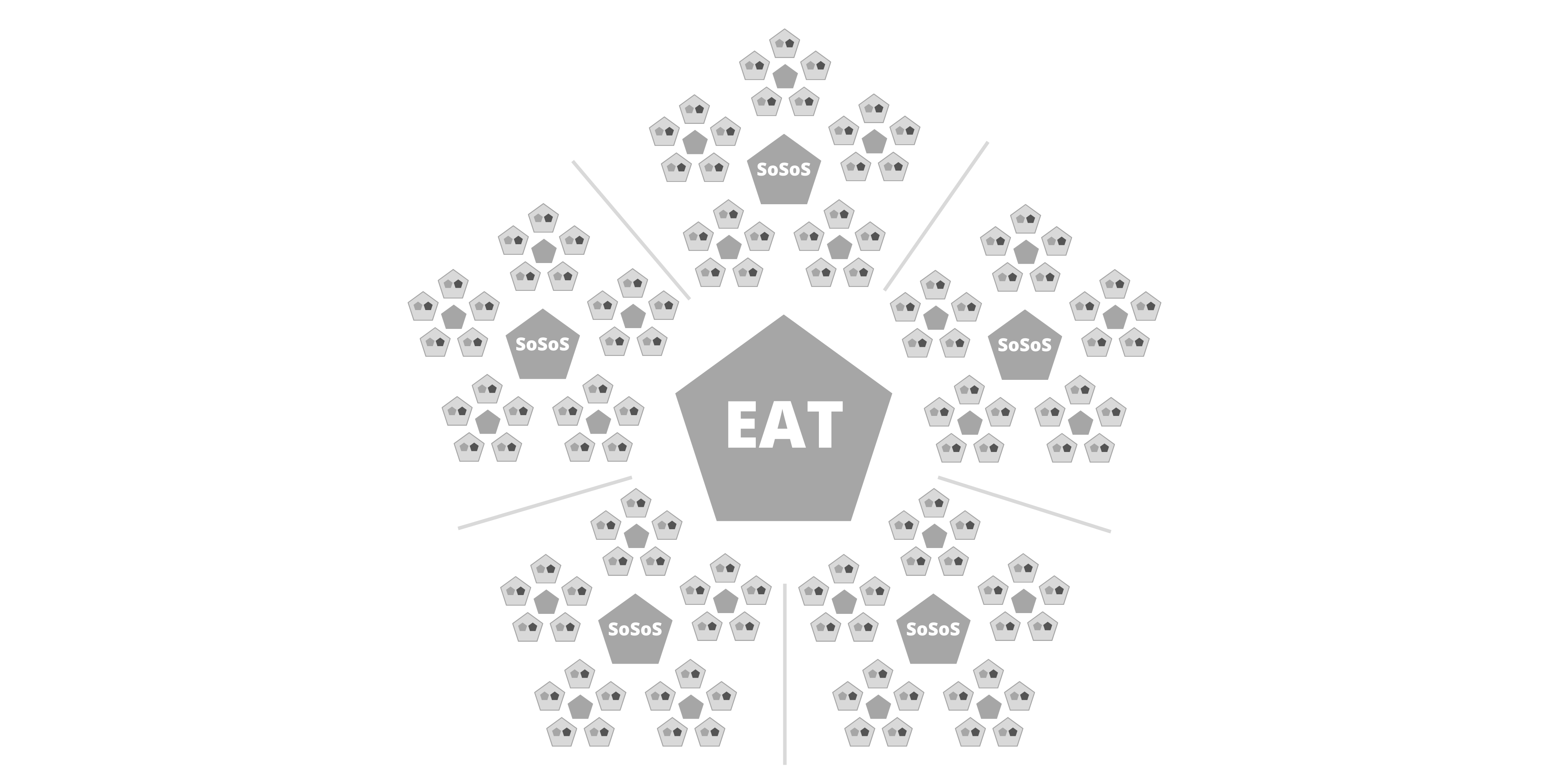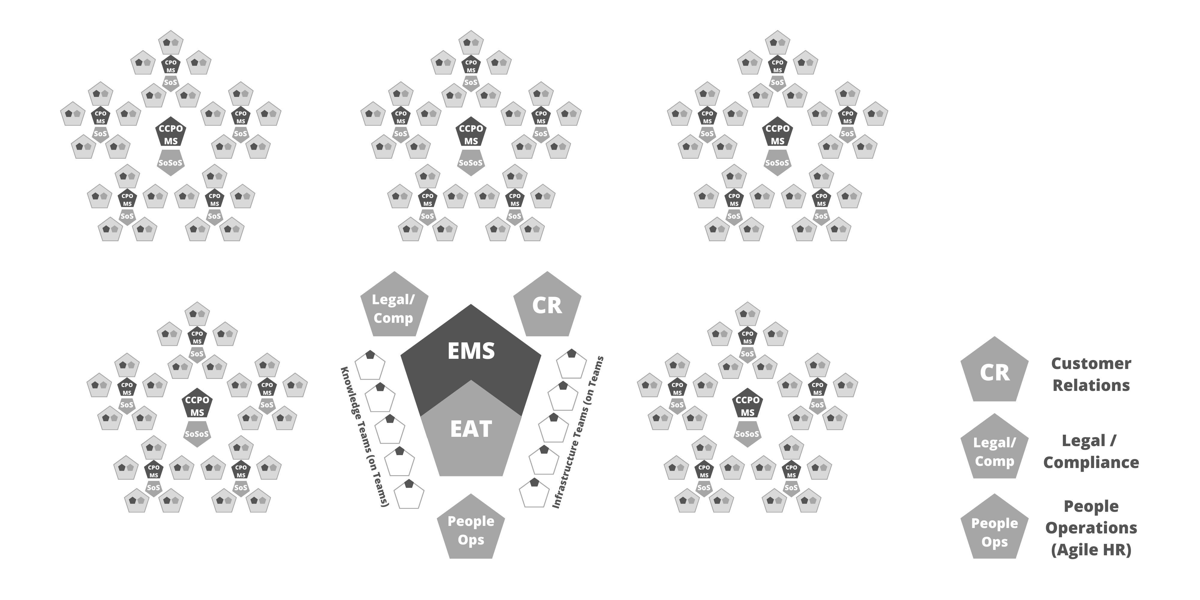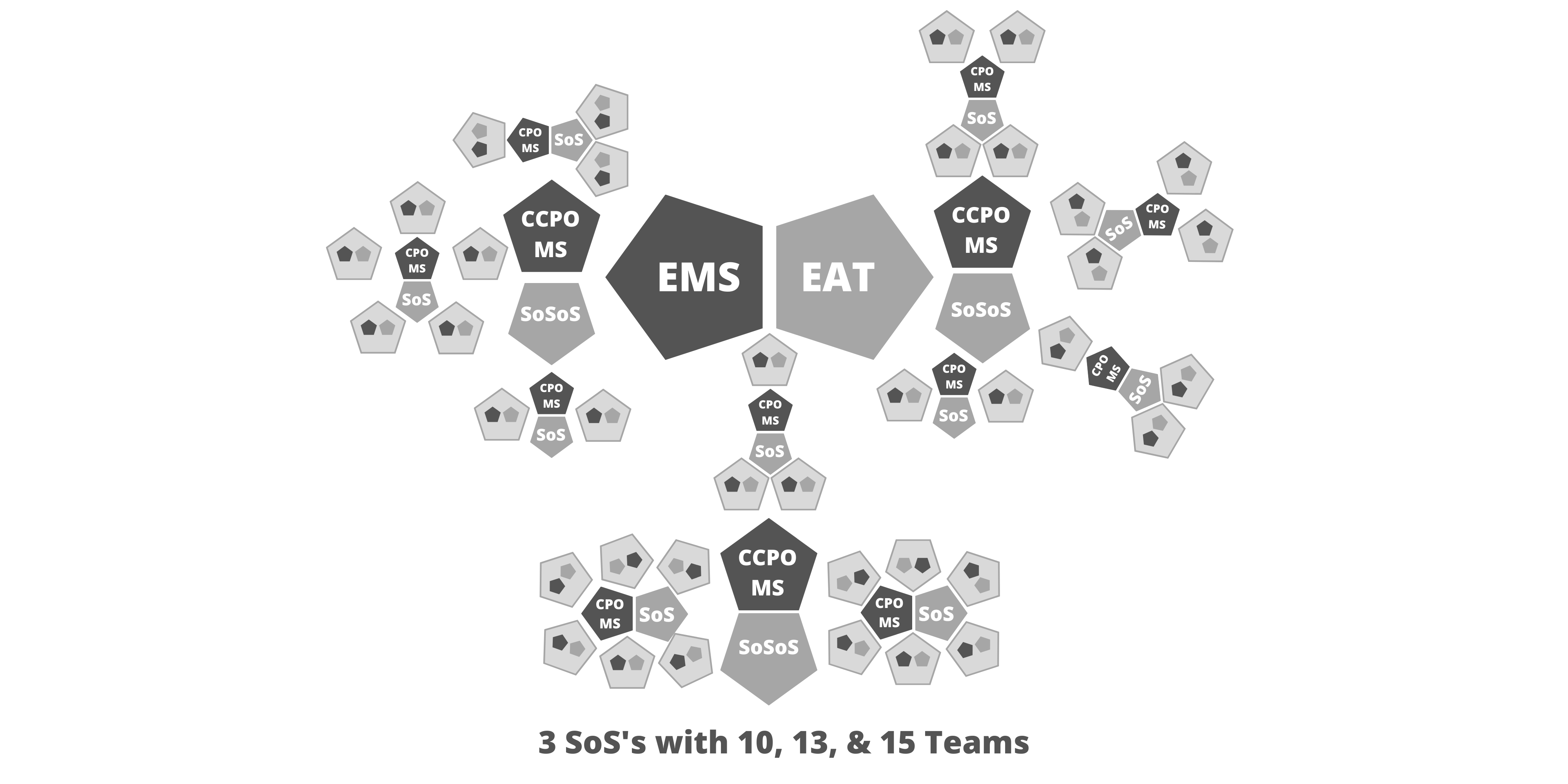 注意: 上図およびこの後の図では、薄い灰色で囲まれた五角形がチームを表す。状況に応じて、SMとPOをこれより小さい五角形で表すことにした。組織図は組織によって大きく異なる可能性があるため、これらの図は例示のみを目的としている。実装の規模に応じて、複雑なプロダクトの提供には複数のスクラムオブスクラムが必要な場合がある。そのような場合には、複数のスクラムオブスクラムからスクラムオブスクラムオブスクラム(SoSoS)を編成できる。それぞれが、各スクラムオブスクラムからスケールされたそれ自身の役割、作成物、イベントを持つことになる。