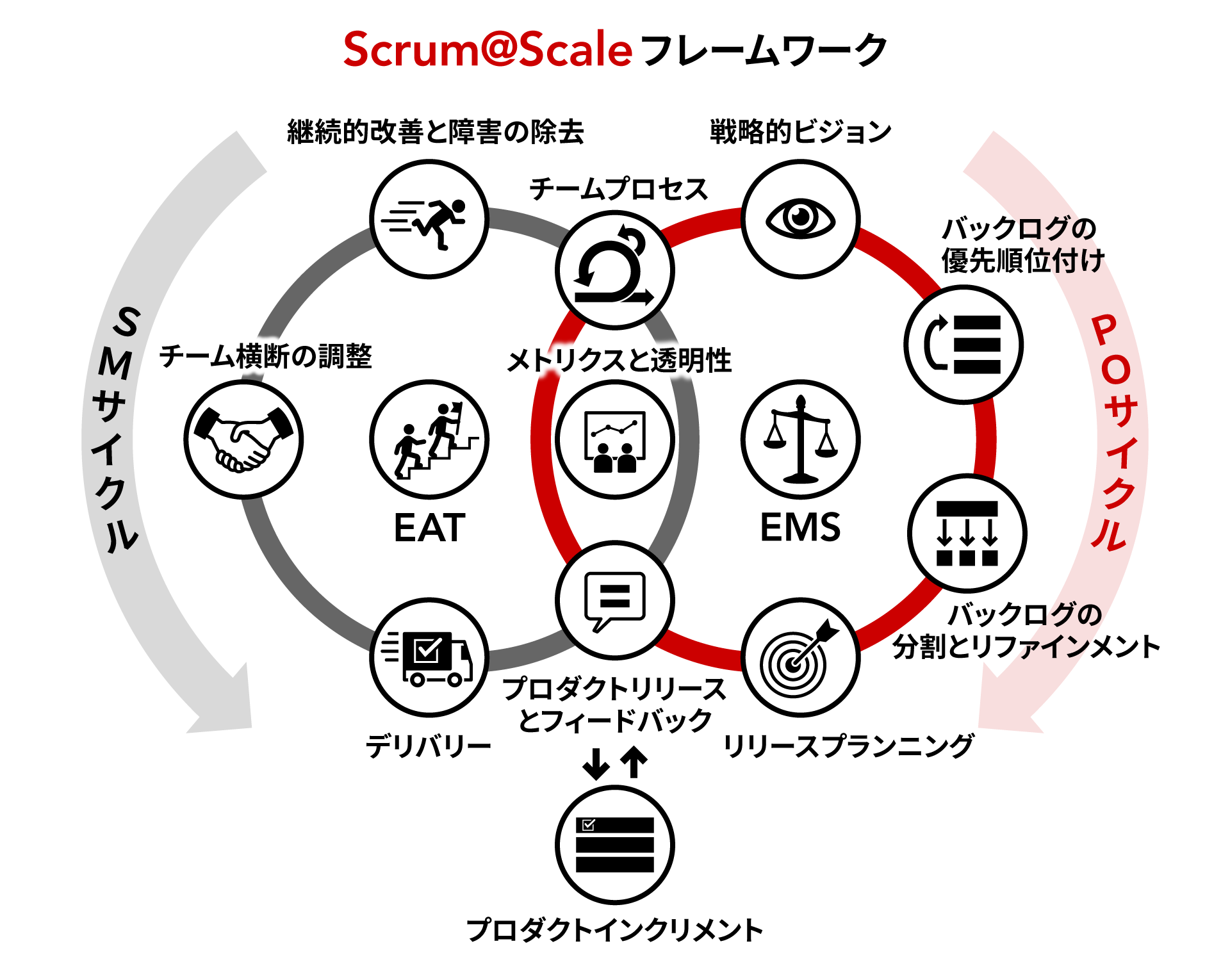 プロダクトオーナー組織(プロダクトオーナー、チーフプロダクトオーナー、エグゼクティブメタスクラム)は、プロダクトオーナーサイクルの以下の固有コンポーネントの要求を満たすために全体として機能する。